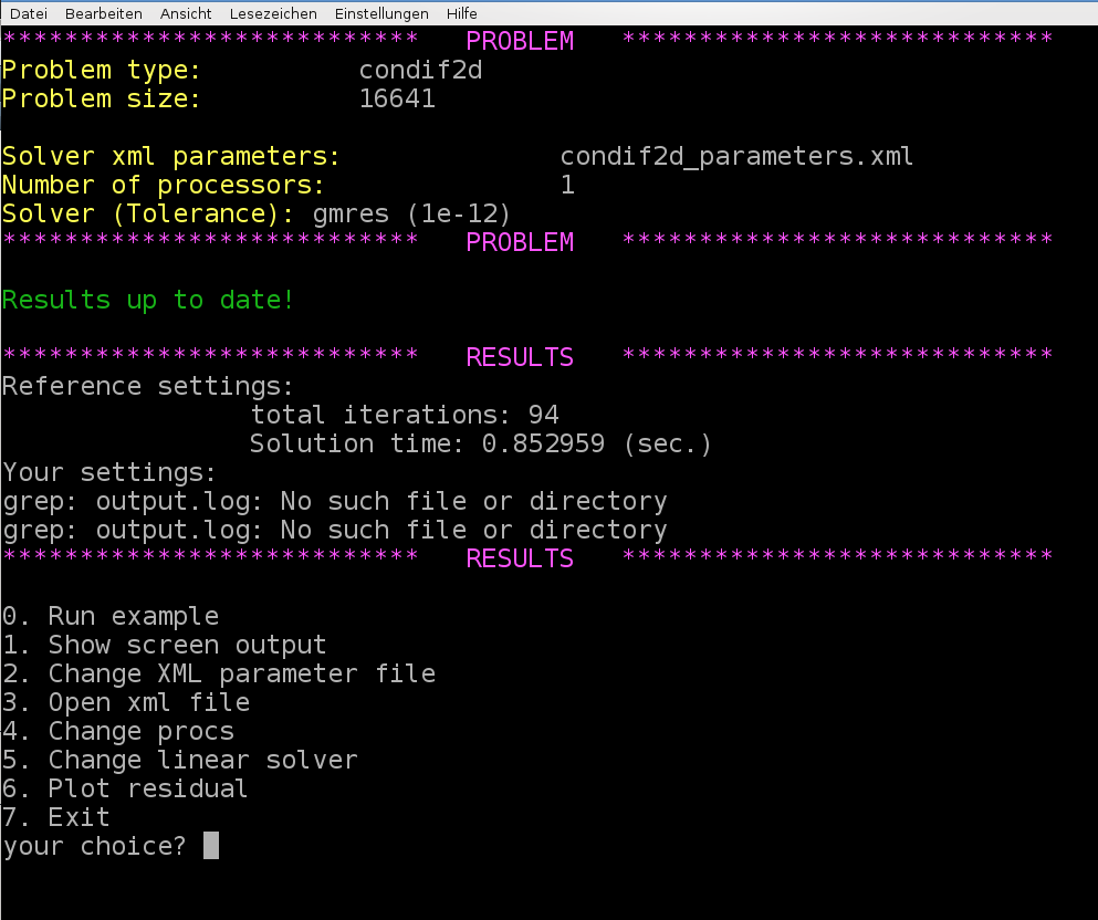 Open the Recirc2D_parameters.xml file by pressing option 3. Try to find optimized multigrid settings using your knowledge from the previous tutorials. Save the file and rerun the example (using option 0). Compare your results with the reference results. With option 6 you can plot the convergence of the relative residual of the iterative solver (for comparison).