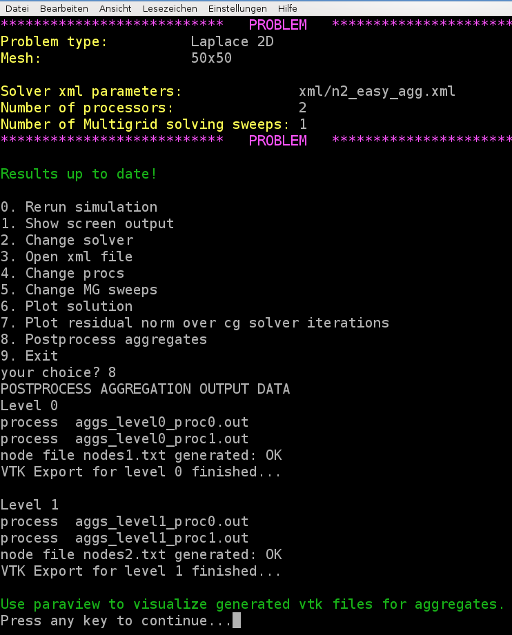 MueLu allows one to export plain aggregation information in simple text files that may be interpreted by post-processing scripts to generate pictures from the raw data. The post-processing script provided with the MueLu tutorial is written in python and produces VTK output. Please make sure that you have all necessary python packages installed on your machine (including python-vtk).